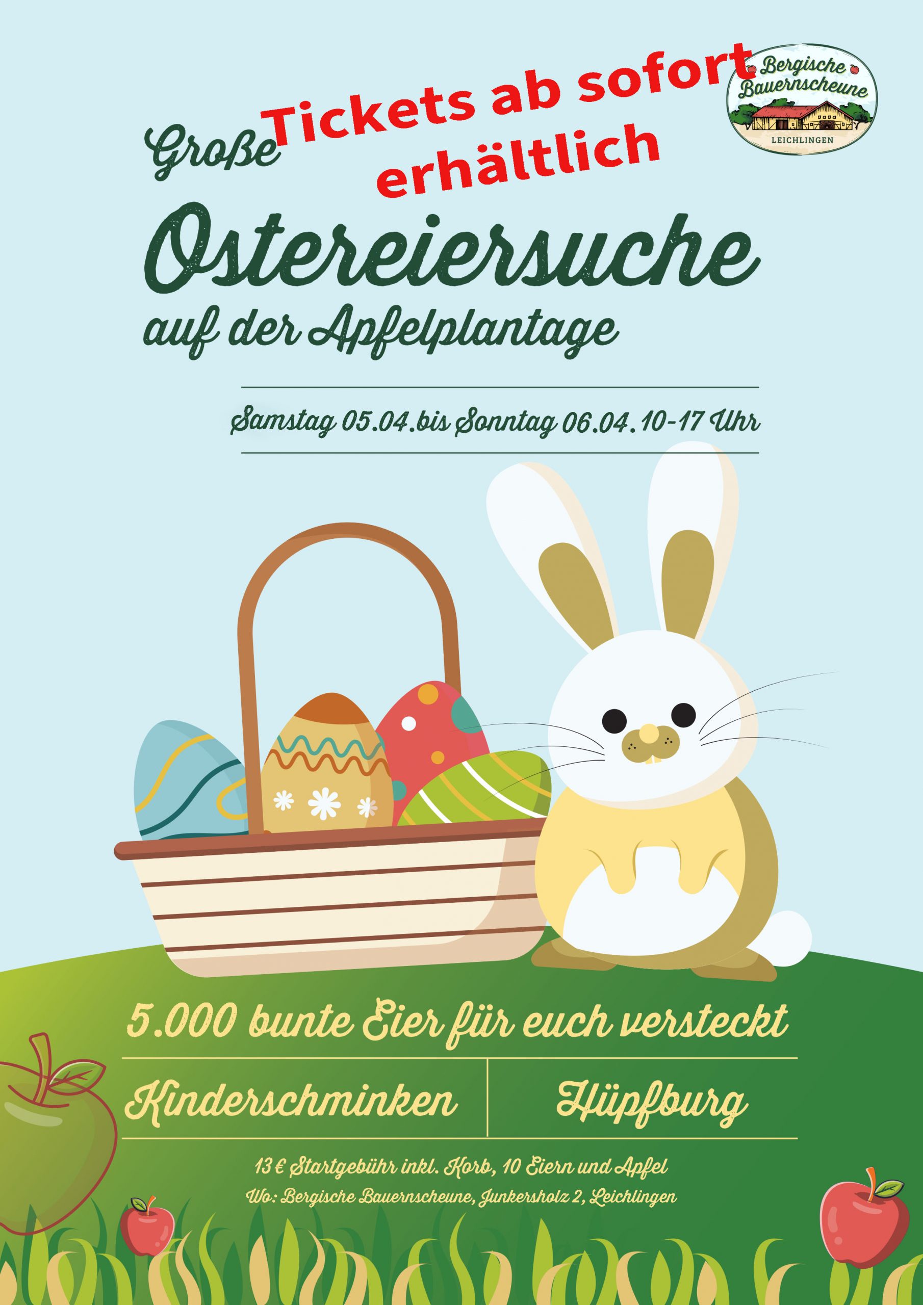 Erlebt ein unvergessliches Osterwochenende auf unserer idyllischen Apfelplantage! Bei unserer großen Ostereiersuche erwartet euch ein buntes Familienevent voller Spaß, Spiel und Überraschungen.